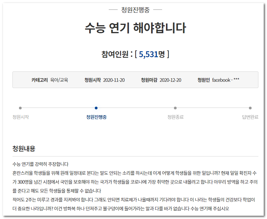 이러한 사회적 분위기로 인해 12월 3일 대학수학능력시험을 앞둔 수험생들의 불안이 점점 고조되고 있는 상황에서 청와대 국민 청원 게시판에는 수능 시험을 연기해달라는 청원이 올라와 눈길을 끌었다. 지금 현재까지 이 청원에 동의한 인원은 5,531명이다. 사안에 대한 정부의 공식 답변을 들을 수 있는 20만명까지는 갈 길이 요원해보인다. 당장 이번주 목요일이 수능시험이기 때문에 이러한 청원으로 인해 수능이 연기될 가능성은 희박해 보인다.