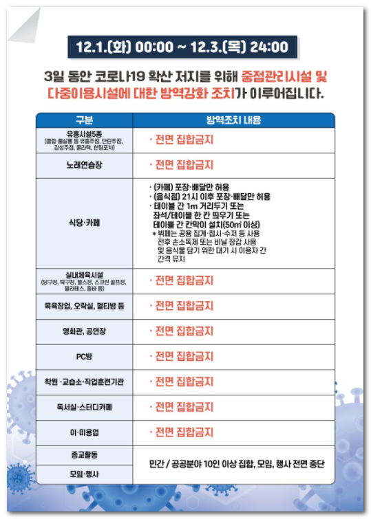 12.1.(화)~12.3.(목) 3일 간 제천시에서 중점관리시설 등 방역강화조치에 대한 행정명령을 시행합니다.