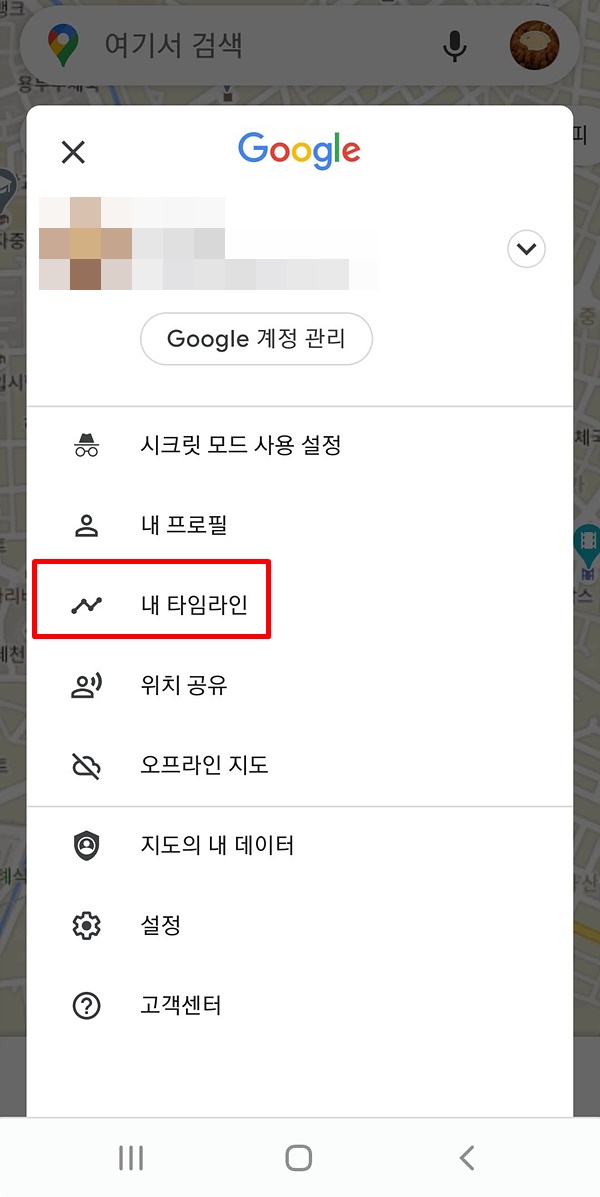 구글맵 어플리케이션에서 우측 상단의 프로필 아이콘을 누르면 새로운 메뉴가 나옵니다.